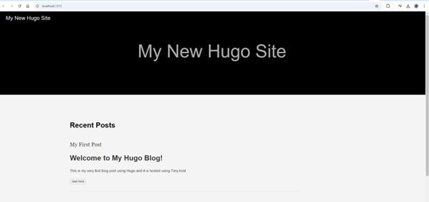 - Open your browser and go to http://localhost:1313. You should see your Hugo website live with the post you just created.